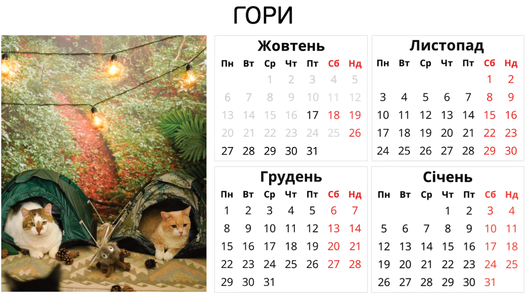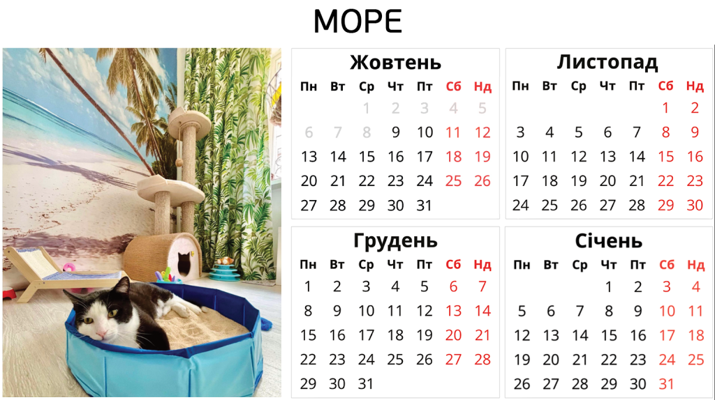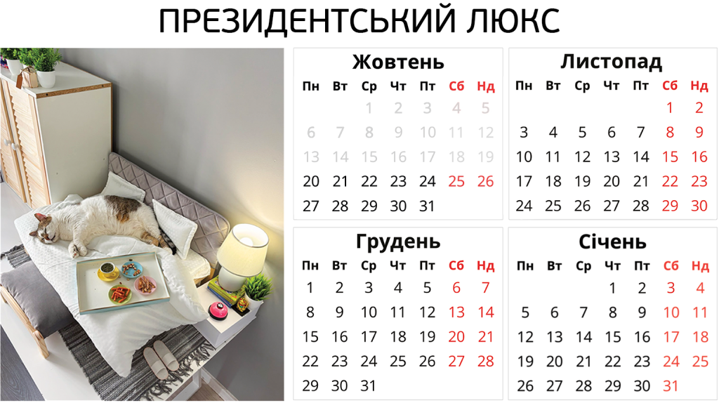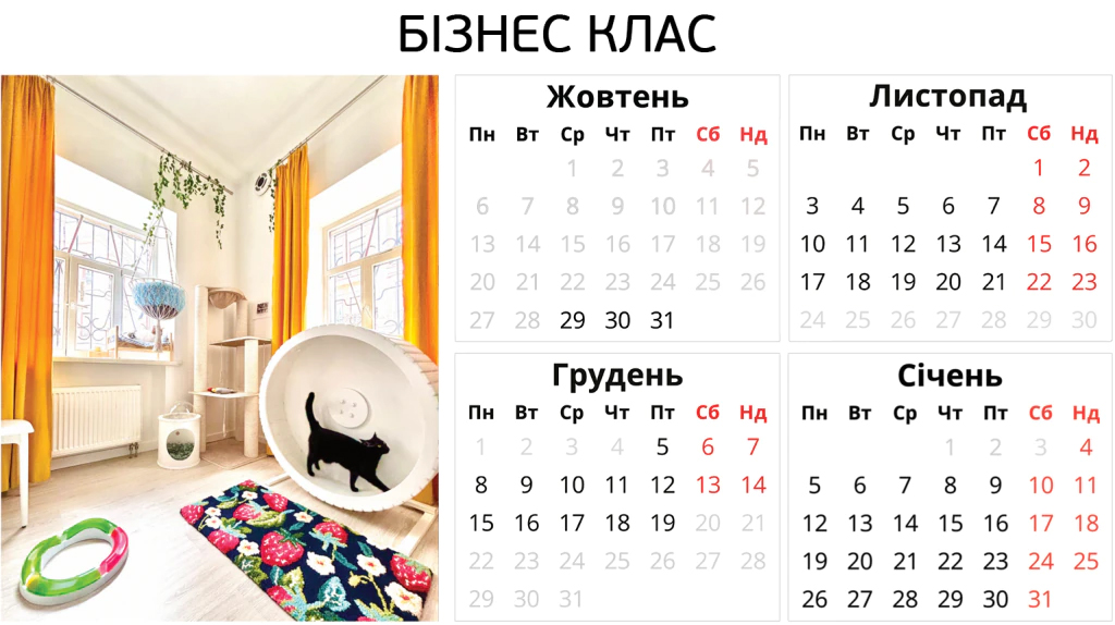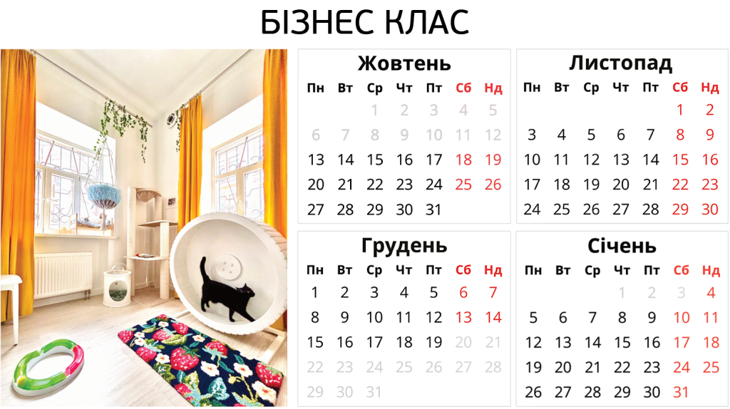 Ніяких боксів – твій котик отримає персональну кімнату в користування. З котячими меблями, безпечними вікнами, відеоспостереженням і нашою турботою. І навіть біговим колесом.