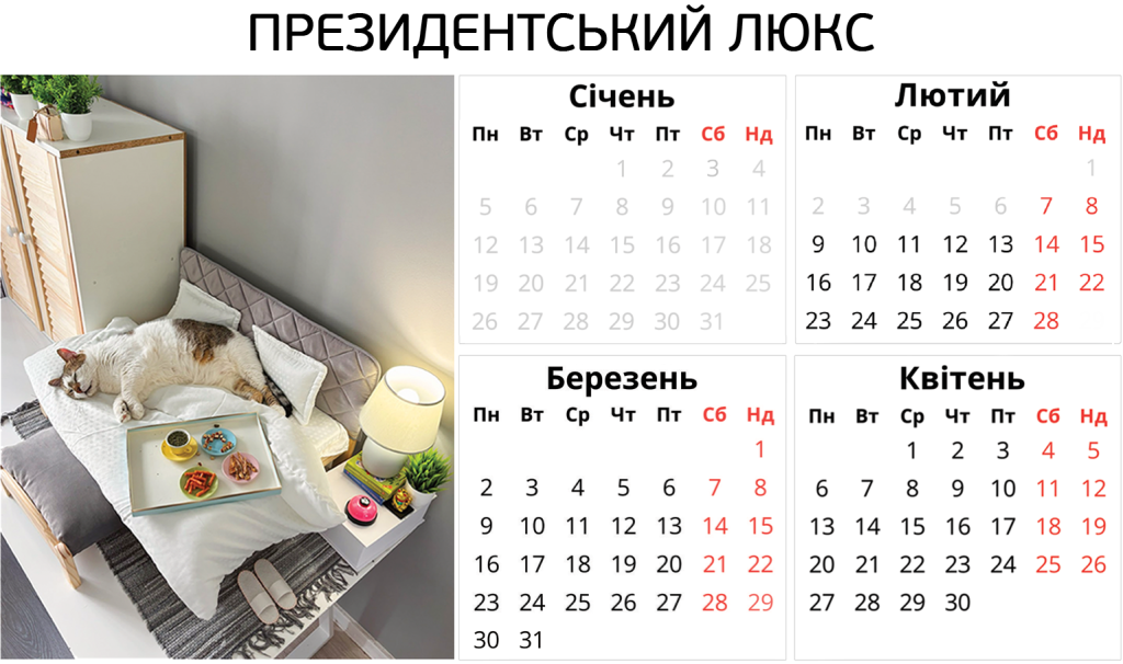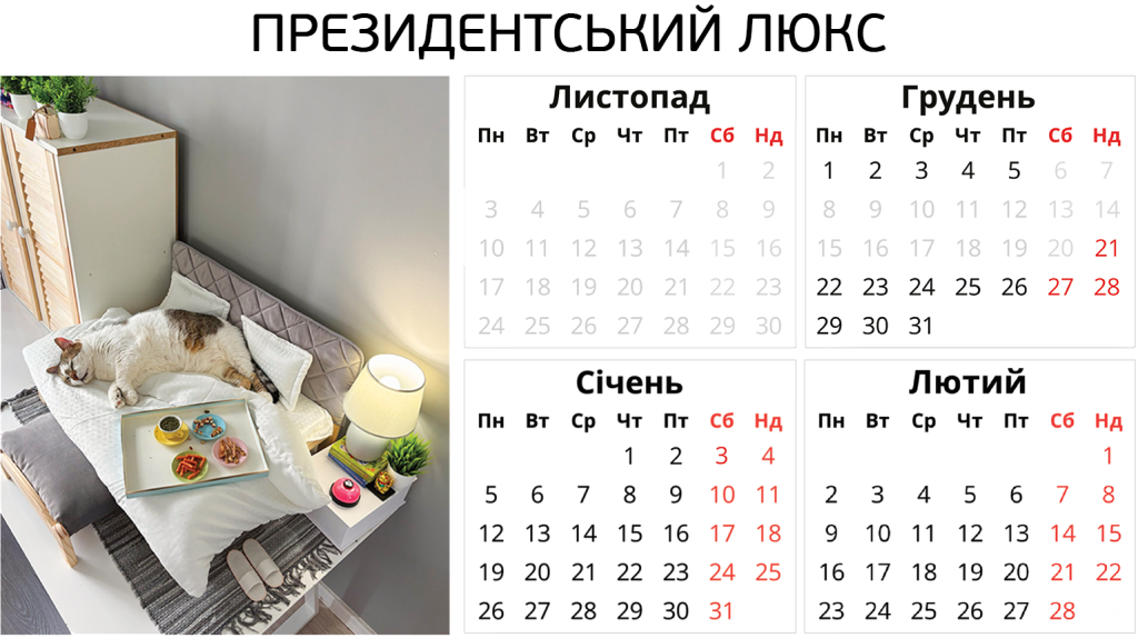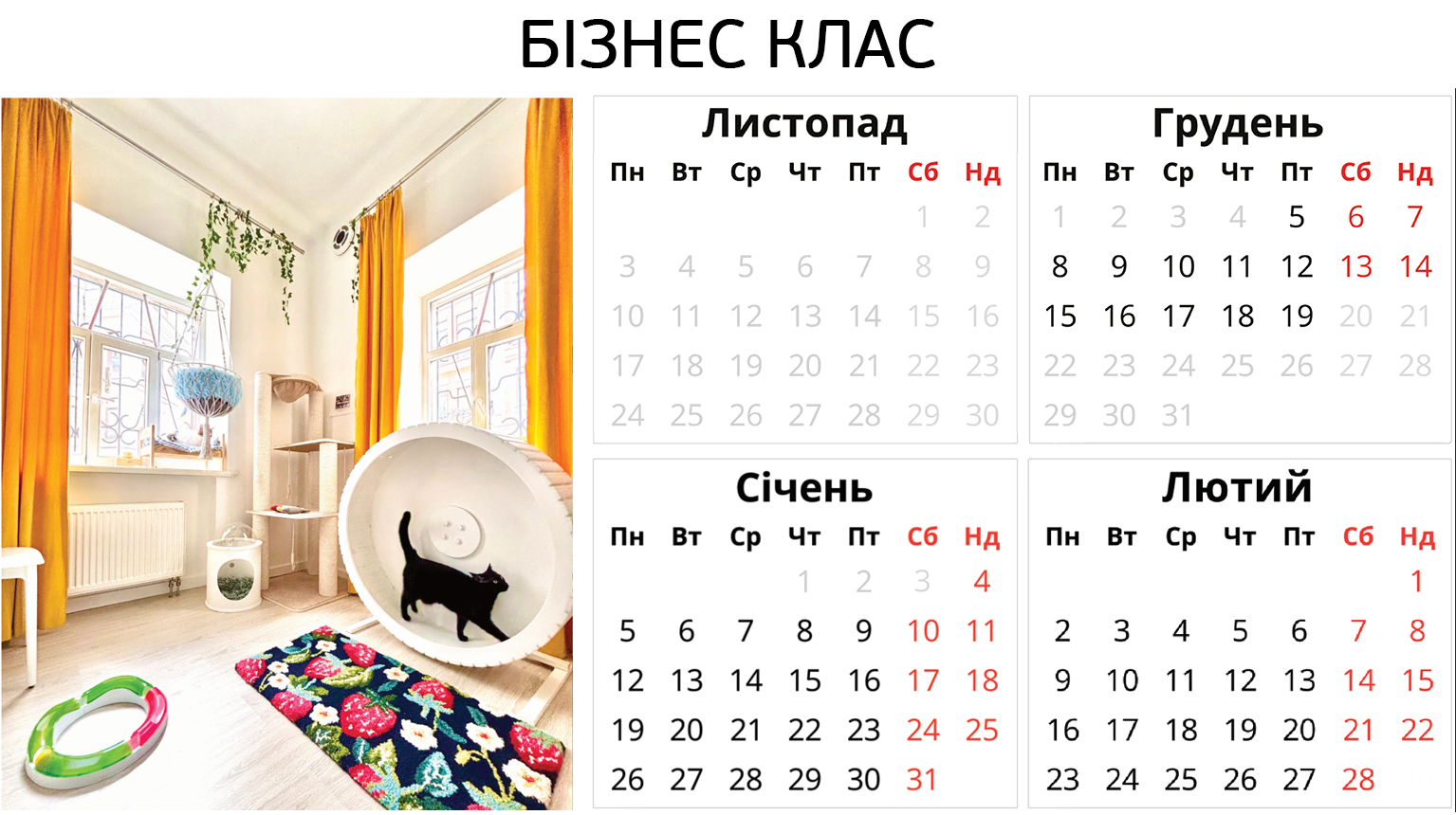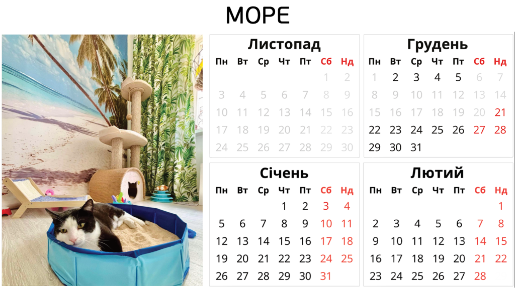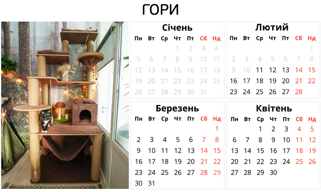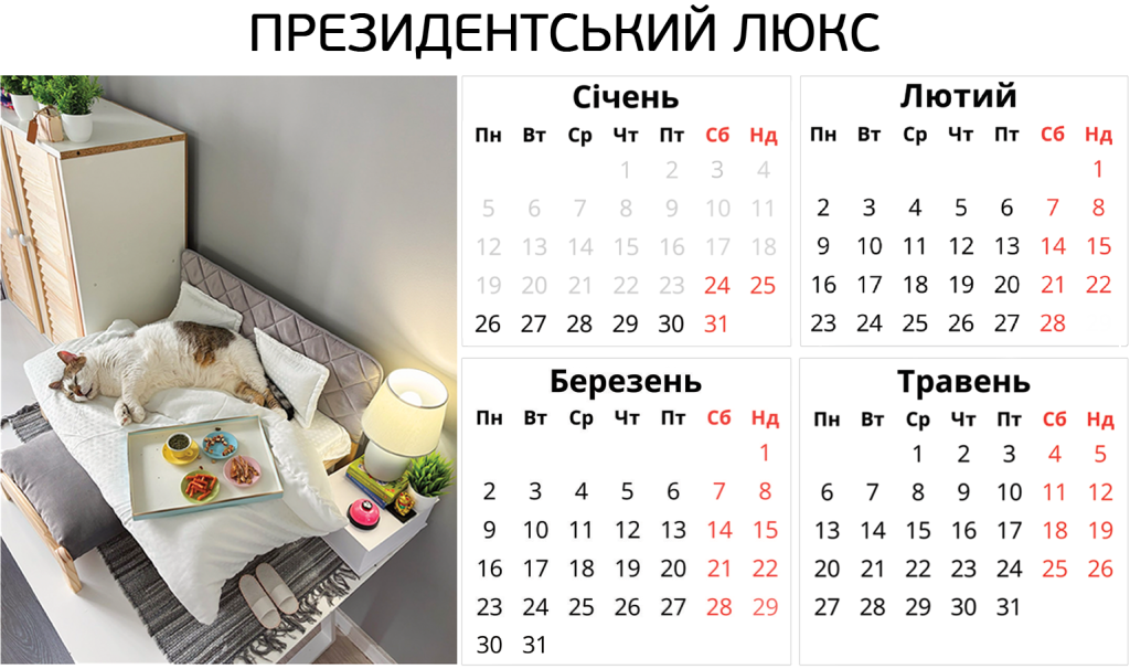 Ніяких боксів – твій котик отримає персональну кімнату в користування. З котячими меблями, безпечними вікнами, відеоспостереженням і нашою турботою. І навіть біговим колесом.