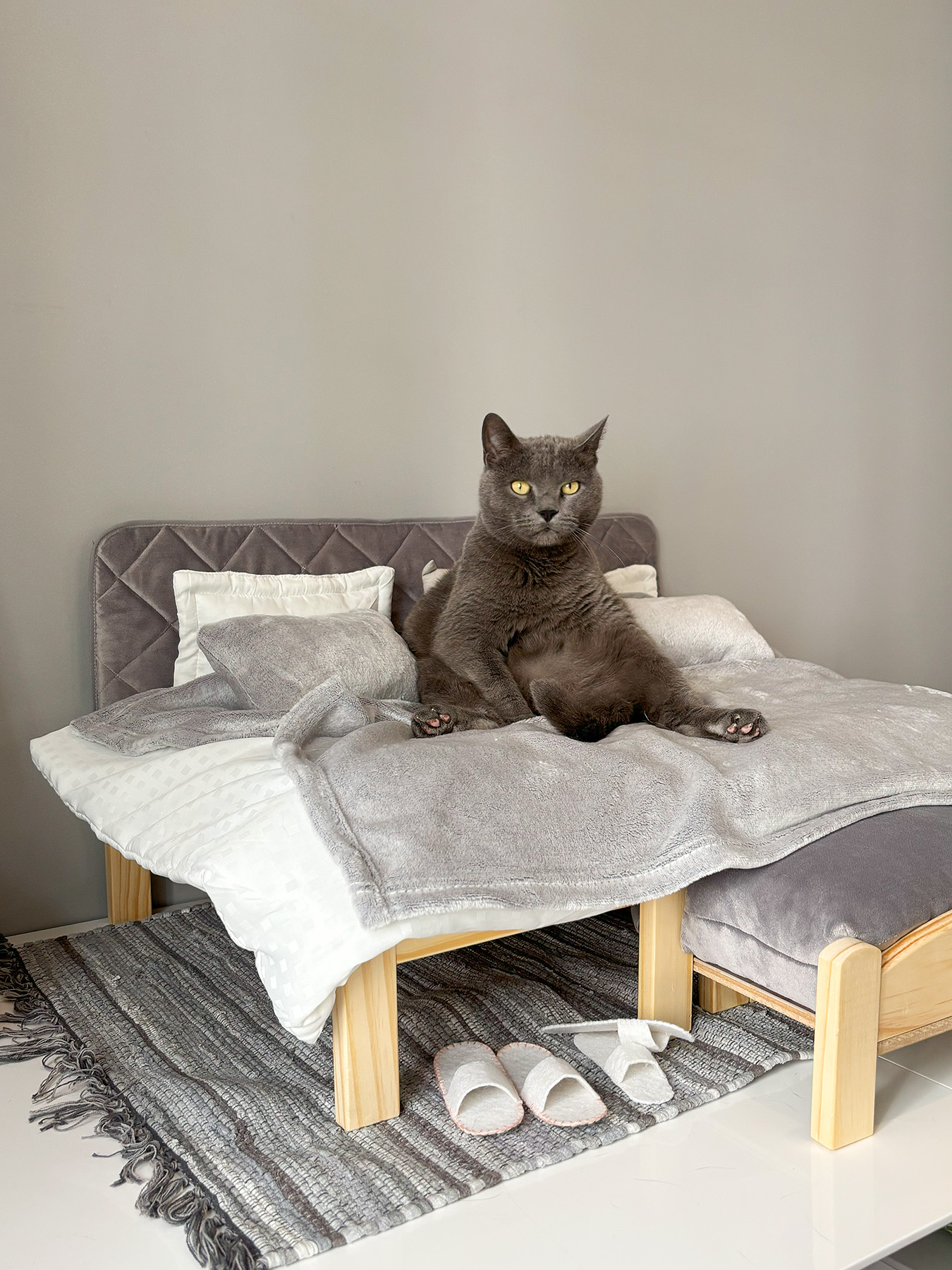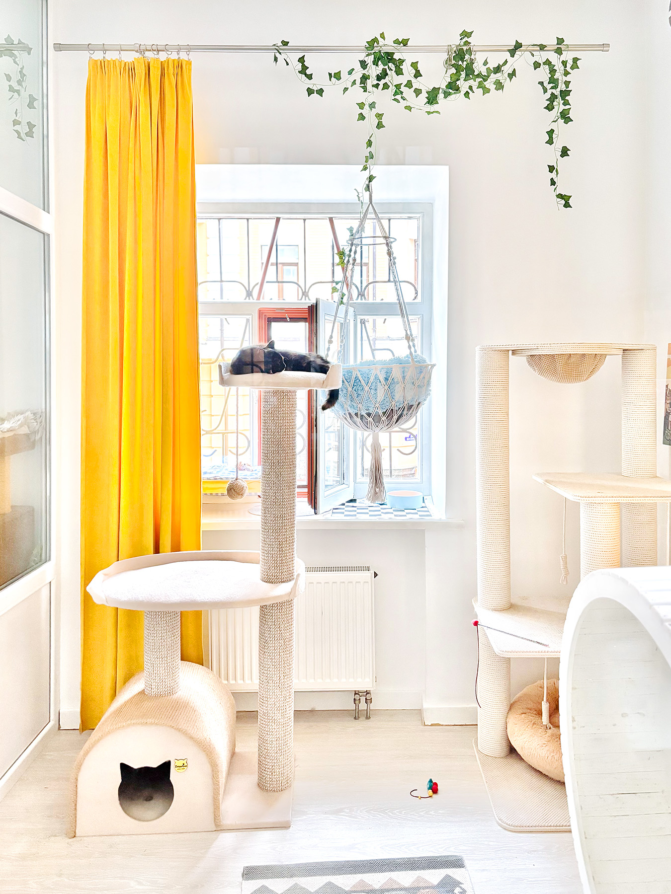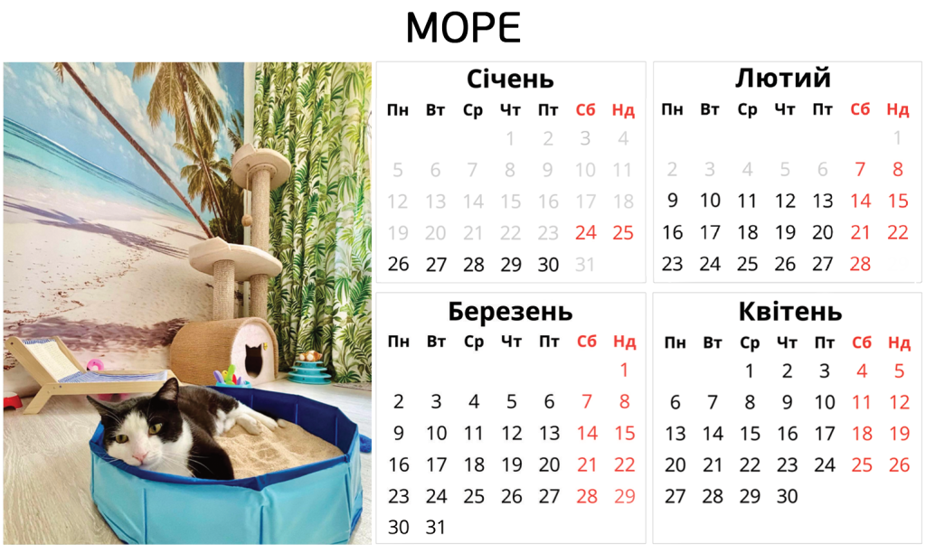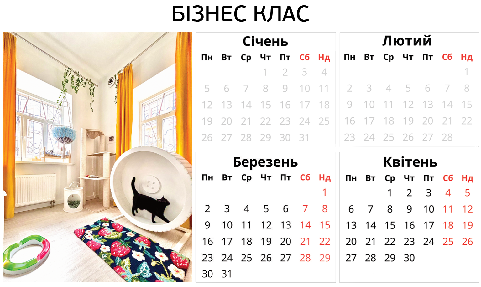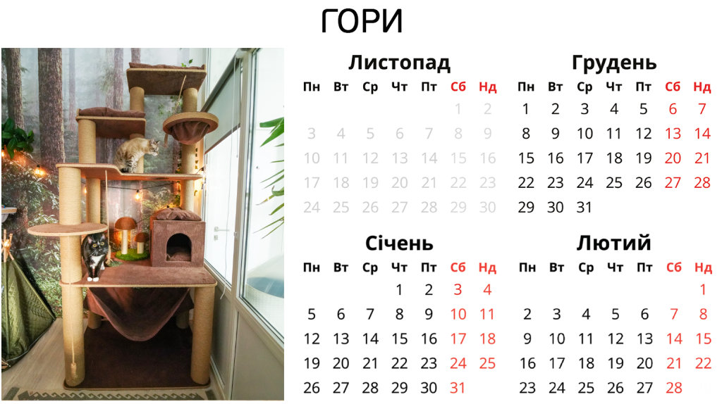Ніяких боксів – твій котик отримає персональну кімнату в користування. З котячими меблями, безпечними вікнами, відеоспостереженням і нашою турботою. І навіть біговим колесом.